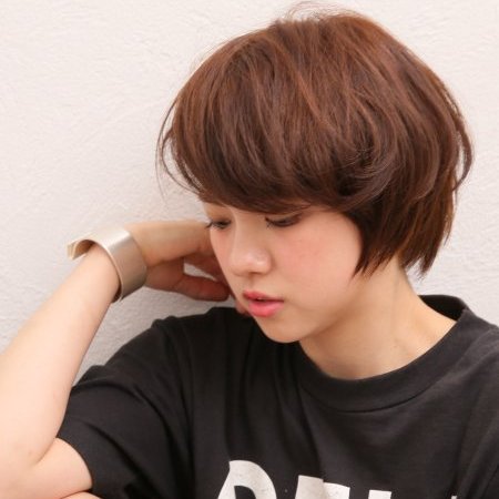 色はココアブラウンでやさしさ。くすみ感でカジュアルにも、つや出しスタイリングすればグラマラスにもなるカットとカラー。